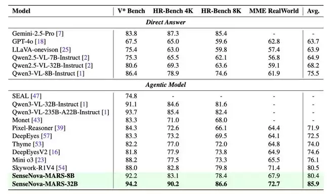 面向视觉理解,在V Bench和HR-Bench等高分辨率感知基准测试中,SenseNova-MARS-32B性能优于Qwen3-VL-235B-A22B等模型。