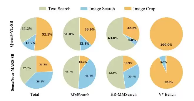 与Qwen3-VL-8B相比,SenseNova-MARS-8B通过动态地为每种任务场景选择最有效的工具,展现出更强的跨任务适应性。