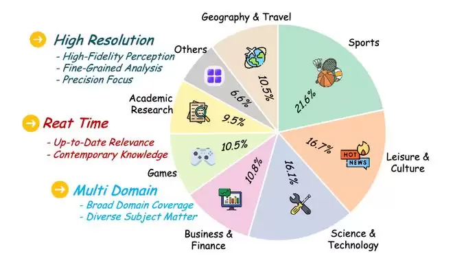 作为评估VLM智能体细粒度感知和搜索推理能力的基准测试。该数据集包含305张4K分辨率的图像,这些图像来自8个不同的、具有高影响力的领域,涵盖体育、休闲文化以及科学技术等。