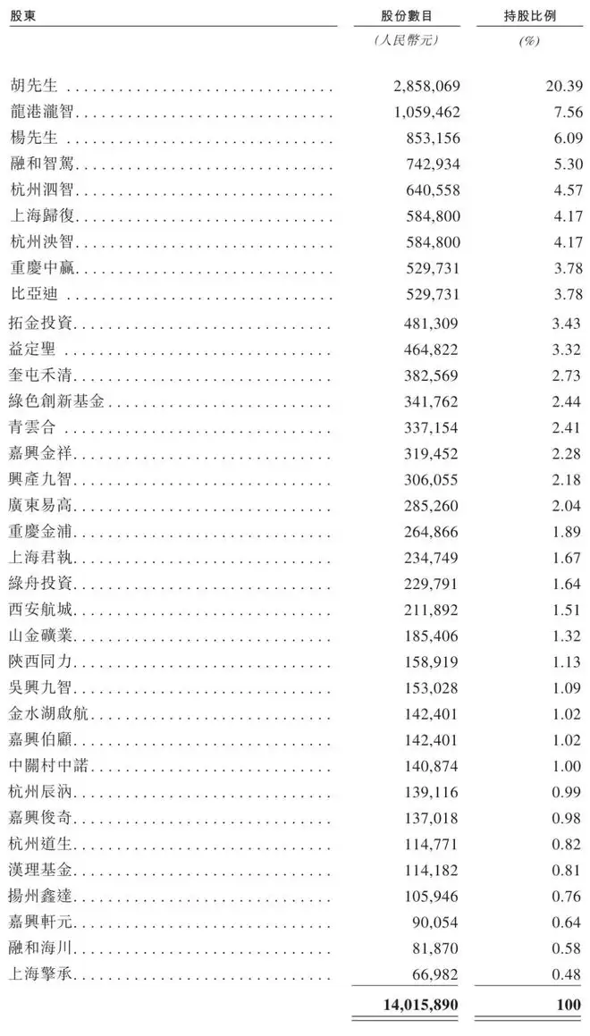 本次上市前,胡心怡女士持股20.39%,龙港湃智持股7.56%,杨扬先生持股6.09%,融和智驾持股5.3%,杭州泗智持股4.57%,上海归复、杭州泊智分别持股4.17%,重庆中赢、比亚迪分别持股3.78%,拓金投资持股3.43%,益定圣持股3.32%,奎屯稷清持股2.73%;