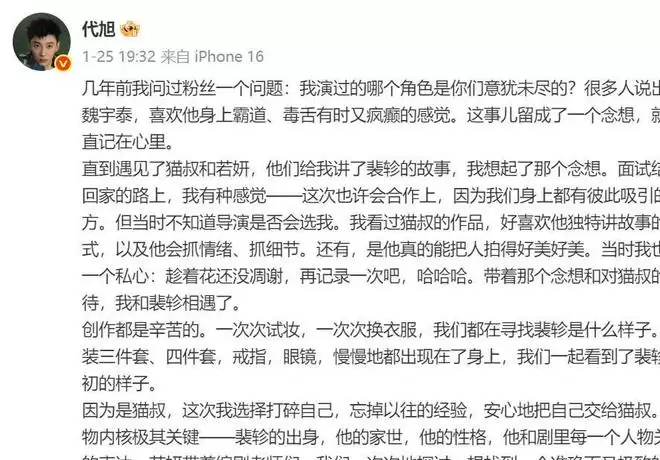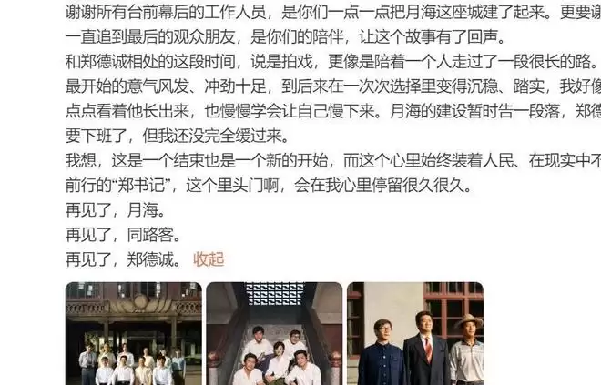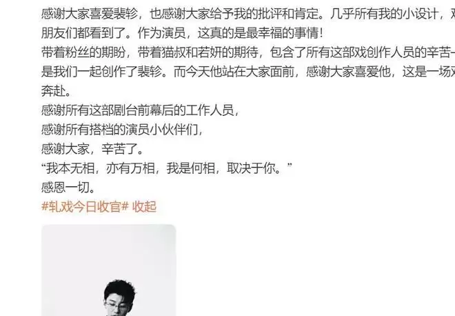 等到真正剧播完之后,演员们一般会发个完结小作文,讲述一下自己和角色的纠缠,感谢一下剧组工作人员之类的。