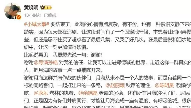 黄晓明《小城大事》告白发长文众星告别,陈明昊等人被忽视的幕后