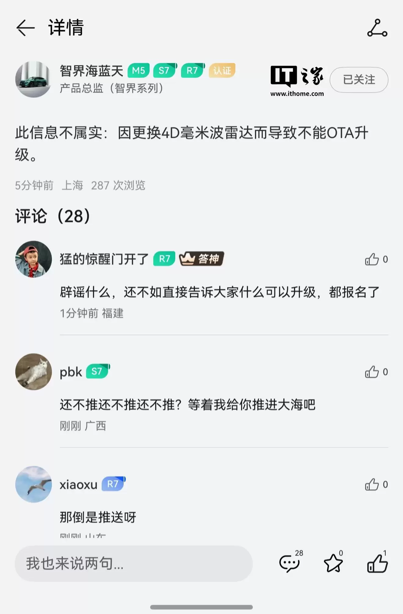 据悉,目前新款智界车型(S7与R7)已陆续开始接收推送,但部分旧款车型用户暂未收到更新。有网络传言称,这与部分旧款车型升级4D毫米波雷达有关,但该说法已遭到官方否认。鸿蒙智行智界产品总监 @智界海蓝天 刚刚发文澄清: