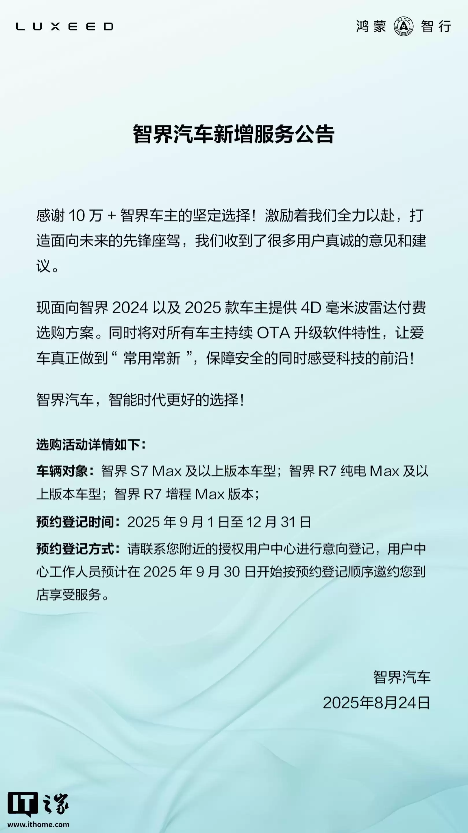 回顾此前报道,去年九月,智界为2024及2025款车型开启了4D毫米波雷达的付费选装意向登记。同年十月,智界产品总监@智界海蓝天 宣布,该雷达支持在用户服务中心进行更换。这意味着升级4D毫米波雷达无需将车辆返厂,在用户中心即可完成更换操作。