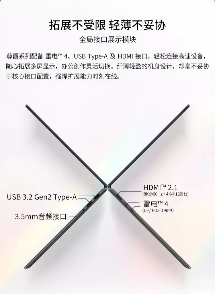 这款笔记本配备了一块14英寸、分辨率为2880×1800、支持120Hz刷新率的OLED醍月屏Pro,采用全金属机身设计,内置真空腔均热板散热系统(包含双风扇和内吹散热),整机重量约1.32公斤,厚度仅为11.9毫米。