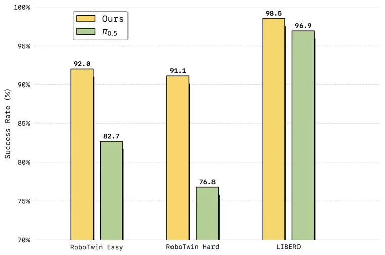 在仿真测评中,LingBot-VA同样表现卓越。在高难度双臂协同操作基准RoboTwin 2.0上,它首次将任务成功率提升至超过90%;在长时序终身学习基准LIBERO上,其平均成功率达到了98.5%,双双刷新了行业纪录。