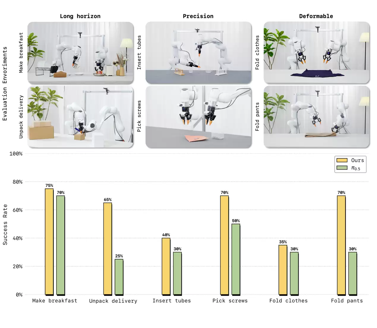 在真机测评中,LingBot-VA展现出了对复杂物理交互的出色适应能力。面对长时序任务、高精度操作以及柔性与关节物体操控这三大类共六项高难度挑战,模型仅需30至50条真机演示数据即可快速完成适配,其任务成功率相比业界强基线Pi0.5平均提升了20%。