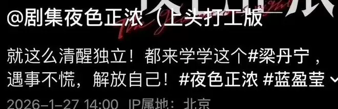 近日翻看蓝盈莹社交平台,发现她于1月28日发布了一支片场花絮短片,画面定格在凌晨三点的补录现场,她正反复调整台词节奏,配文写道:“梁丹宁教会我,真正的力量感,从来不是无所畏惧,而是心跳加速时仍能稳住声线、迈准步伐。”