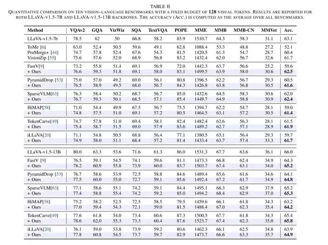 在实验验证中,该团队将Attention Debiasing方法集成到FastV、PyramidDrop、SparseVLM、HiMAP、TokenCarve、iLLaVA等6种主流attention-based剪枝方法中,在10个图像理解基准与3个视频理解基准上进行了系统评估,并覆盖LLaVA-7B / 13B等多种主流Vision-Language Models