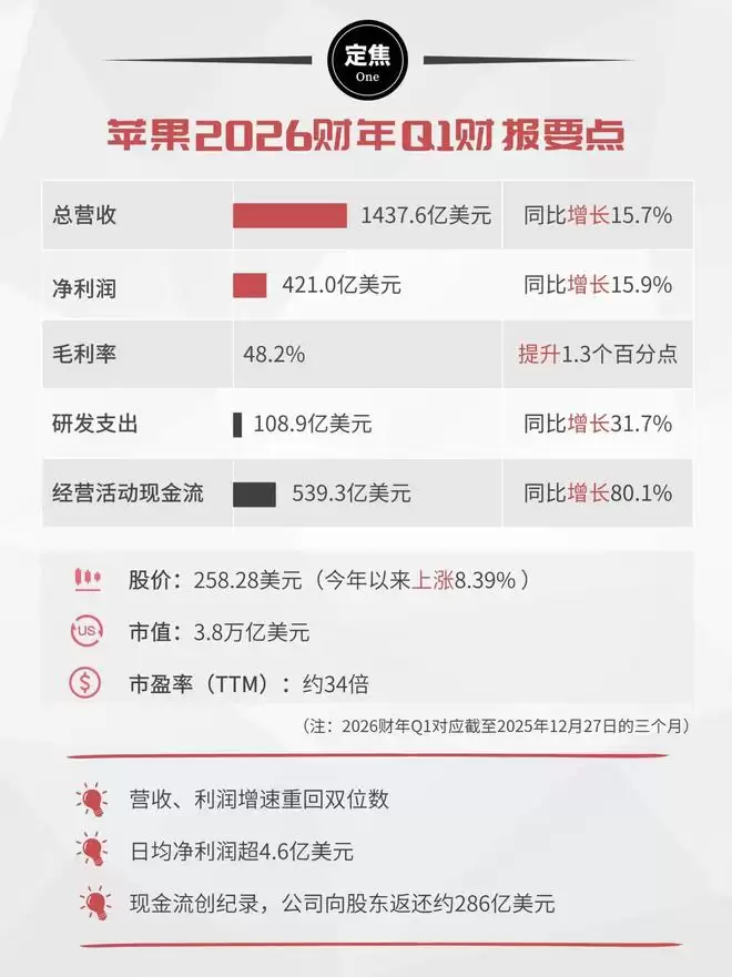 2026年1月29日,苹果公司公布了截至2025年12月27日的2026财年第一季度业绩。