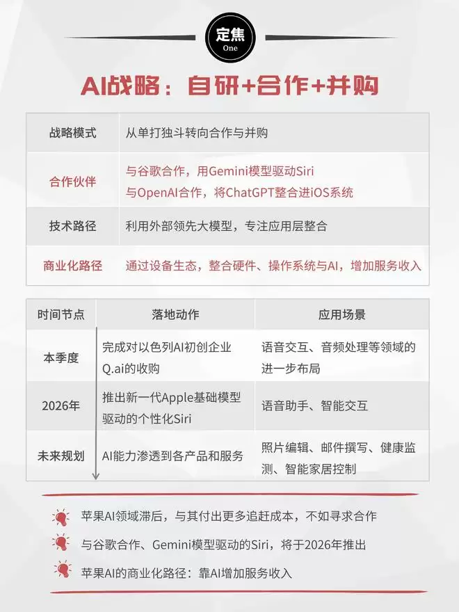AI战略的“务实”调整,是本季度的第三大看点。财报电话会证实,苹果将与谷歌合作,采用Gemini模型驱动更个性化的Siri,并将于今年晚些时候推出。此前,苹果已经和OpenAI达成合作,将ChatGPT整合进iOS系统。财报还提及,本季度已完成对以色列AI初创公司Q.ai的收购。