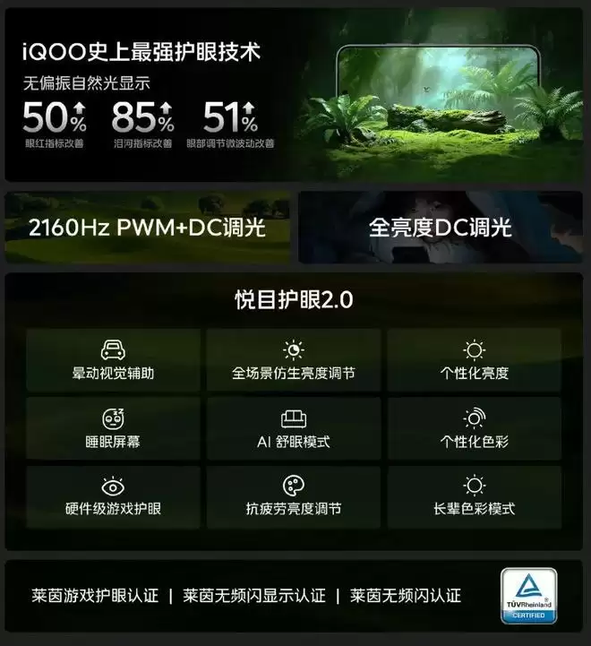 iQOO15 Ultra屏幕还支持 2160Hz PWM+DC 调光、全亮度 DC 调光、悦目护眼 2.0,通过莱茵游戏护眼认证、莱茵无频闪显示认证、莱茵无频闪认证。