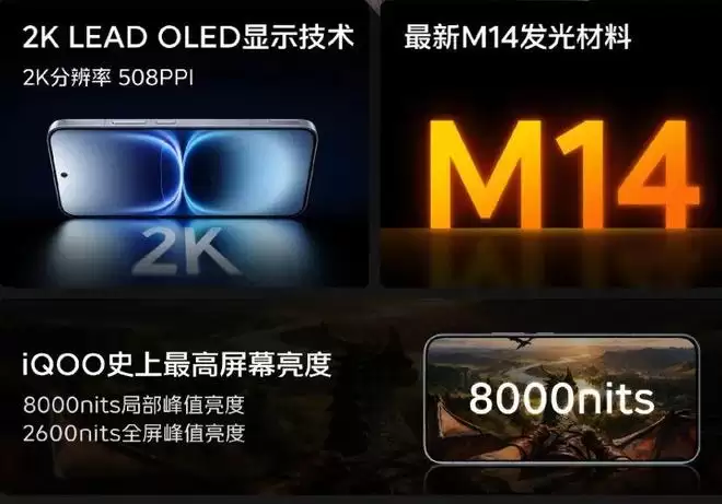 结合最新海报来看,iQOO15 Ultra屏幕采用 2K LEAD OLED 显示技术,支持 2K 分辨率、508PPI;最新 M14 发光材料,iQOO 史上最高屏幕亮度,支持 8000nits 局部峰值亮度、2600nits 全屏峰值亮度。