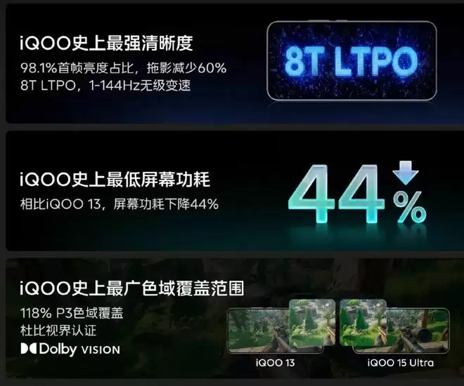iQOO 史上最强清晰度,98.1% 首帧亮度占比,拖影减少 60%,8T LTPO,1-144Hz 无级变速;iQOO 史上最低屏幕功耗,相比 iQOO 13 下降 44%;iQOO 史上最广色域覆盖范围,118% P3 色域覆盖,杜比视界认证。