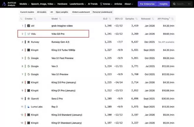 智东西1月30日报道,今日,来自生数科技的AI视频模型Vidu Q3 Pro登上国际权威AI基准平台Artificial Analysis榜单,位列中国第一,全球第二。