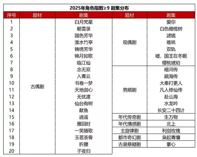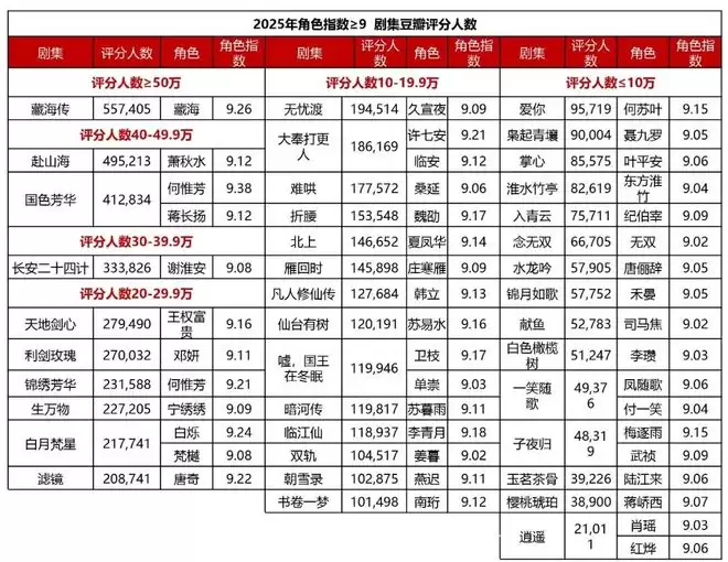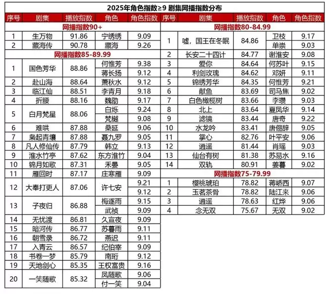 来自演员本人的热度效应,也是角色出圈的重要原因。下图为角色指数在9分以上的演员,以及他们在2025年的作品盘点。