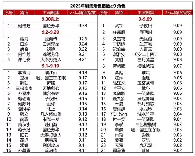 角色指数在9.10分+以上的有16位,在9.0分+的为24位。