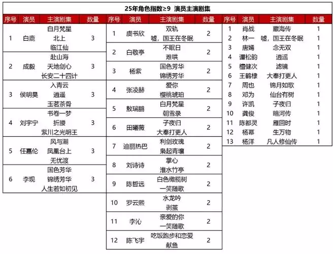作品数量在3部的有6位演员,其中白鹿、成毅和侯明昊在2025年各有3部作品播出,角色指数均在9分以上。刘宇宁有3部作品播出,其中2个角色指数均在9分以上。