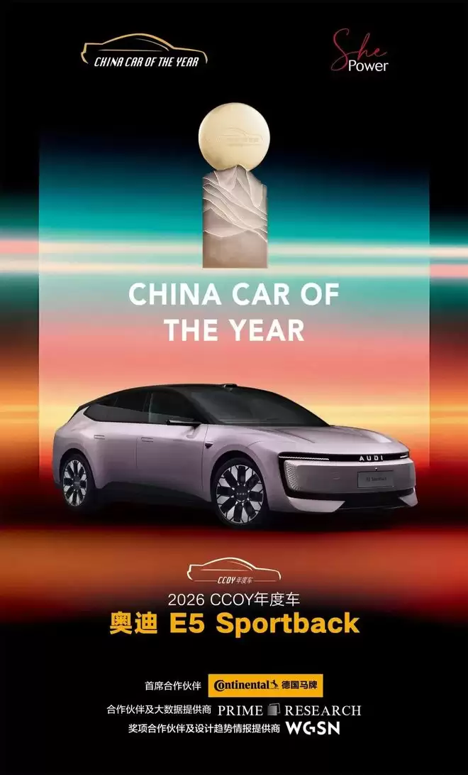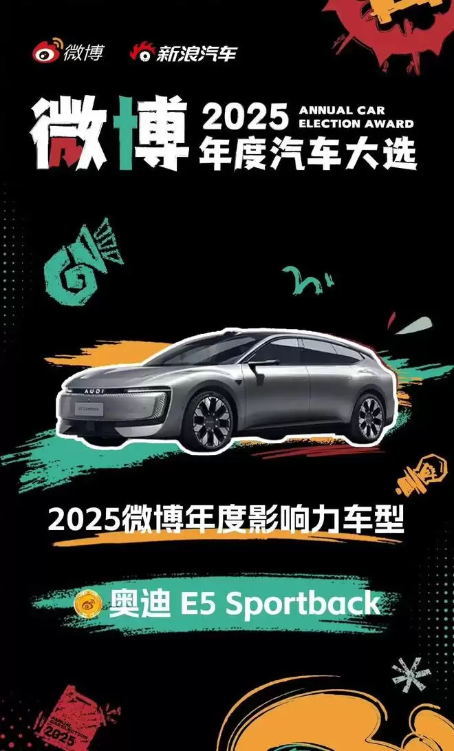 近期,奥迪E5 Sportback在多个年度车评选体系中获得关注与认可:先斩获专业评审主导的CCOY“2026中国年度车”大奖,后又在全民参与为机制的微博年度车评选中,连续斩获2025微博年度车型(Weibo Car of the Year)、2025微博年度影响力车型(2025 Weibo Annual Influential Vehicle)两项大奖。