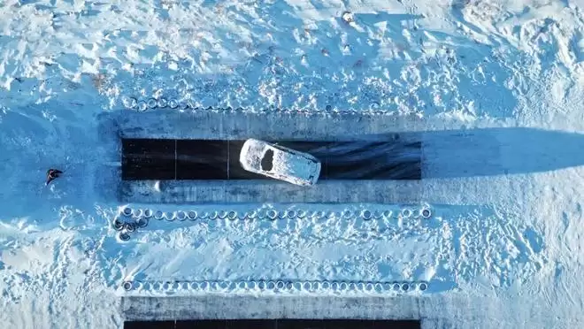 车辆在雪和水的反复覆盖下被冻结成“冰雕”,整晚静置,让电池、电机和整车系统处于深度低温状态。随后,通过远程启动空调唤醒车辆,空调效率、热管理介入节奏、电芯回温过程、整车系统恢复速度,每一个环节的表现,都对应着用户冬季用车中最真实的风险情境。