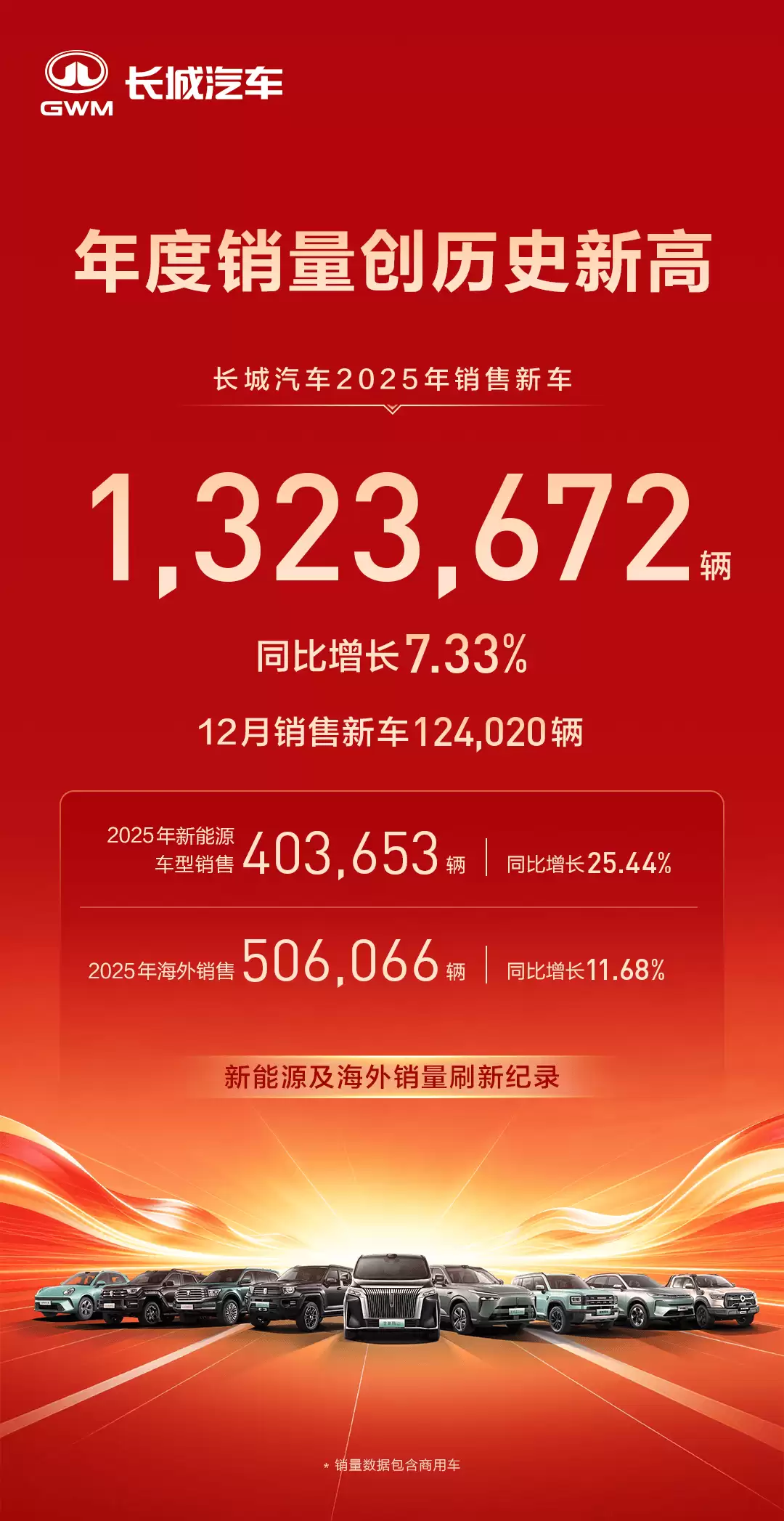 销量方面的表现同样令人瞩目。2025年,长城汽车全球销量突破132.37万辆,同比增长7.33%。其中,新能源车型贡献了40.37万辆的销量,增速高达25.44%,远超整体增速。这一成绩印证了企业电动化战略的成功——通过Hi4智能四驱电混等技术创新,长城成功将四驱性能与两驱能耗相结合,相关车型已形成覆盖城市通勤与户外轻越野的全场景产品矩阵。该技术更荣获中国汽车工程学会特等奖,被业内专家评价为“为全球越野电动化提供了中国方案”。