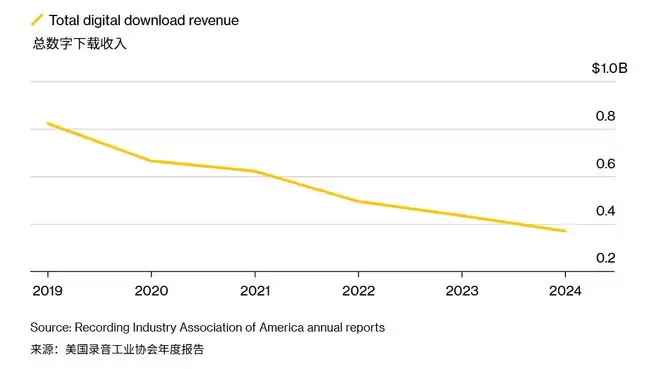 从营收层面看,付费下载的市场份额已微乎其微。美国唱片业协会发布的2025年中期收入报告显示,2025年上半年美国数字下载(含铃声等)总收入仅为1.39亿美元,而同期流媒体收入高达47亿美元,两者差距悬殊。
