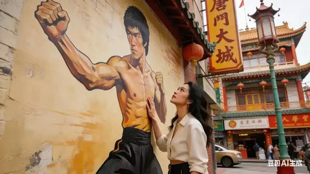 这场跨次元邂逅的名场面,藏着满屏治愈细节。洛杉矶唐人街的红灯笼下,袁娅维身着休闲卫衣搭配牛仔裤,踩着小白鞋穿梭在充满东方烟火气的街巷,正对着李小龙经典壁画驻足欣赏,眼神里满是对传统文化的共鸣。可下一秒转身,墙上悬挂的周深海报猝不及防映入眼帘——海报中的周深身着西装,笑容明亮,与袁娅维的休闲画风形成奇妙反差。她下意识喊出名字的模样,像极了普通人逛街偶遇老友海报的真实反应,毫无偶像包袱的自然状态,比刻意设计的综艺桥段更具感染力。