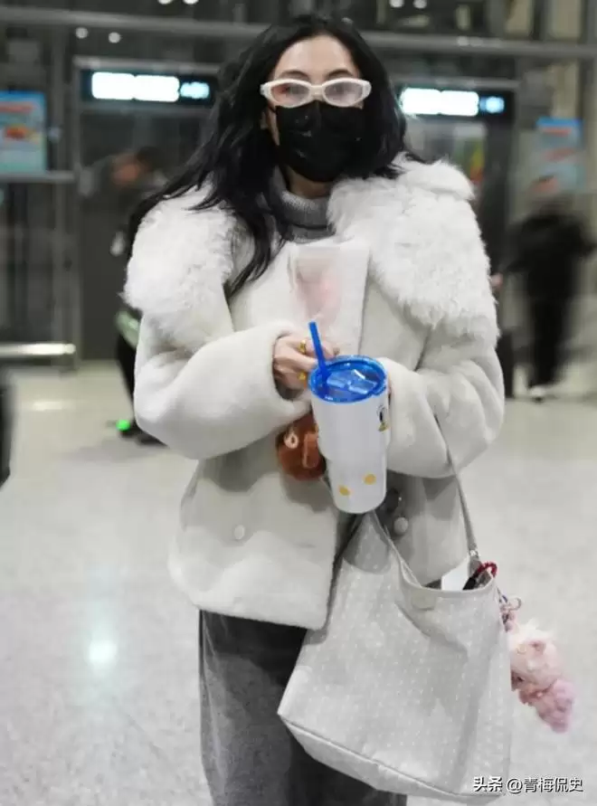 当天她包裹严实,白框茶色墨镜遮不住精致轮廓,乌黑长发随意披肩,白色毛绒外套搭配灰色长裙,温柔大气。