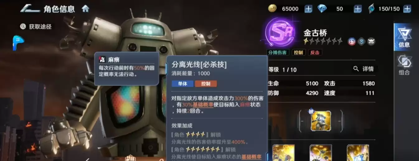 金古桥的核心机制,源于那套将防御格挡与辅助保护巧妙融合的战斗体系。实战中,其被动能量盾能直接提升20%的格挡率,这让它在面对高频攻击时拥有极强的生存底气。通过将基础硬度与被动触发深度绑定,并配合必杀技分离光线产生的两回合麻痹判定,金古桥在面对单体BOSS时战术权重很高,能在承受伤害的同时有效限制对手的行动自由。