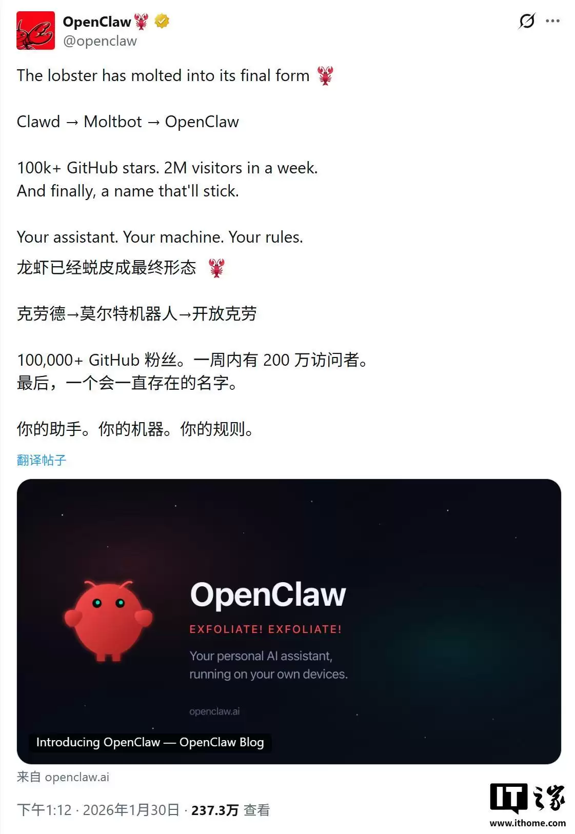 1月31日,据IT之家消息,一款迅速走红的开源人工智能体Clawdbot在短短数小时内经历了两次更名。在短暂更名为Moltbot后,开发团队迅速调整策略,最终将名称定为更顺口的OpenClaw。
