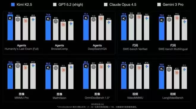 Kimi K2.5 在多个领域的最新评分|图源:Kimi