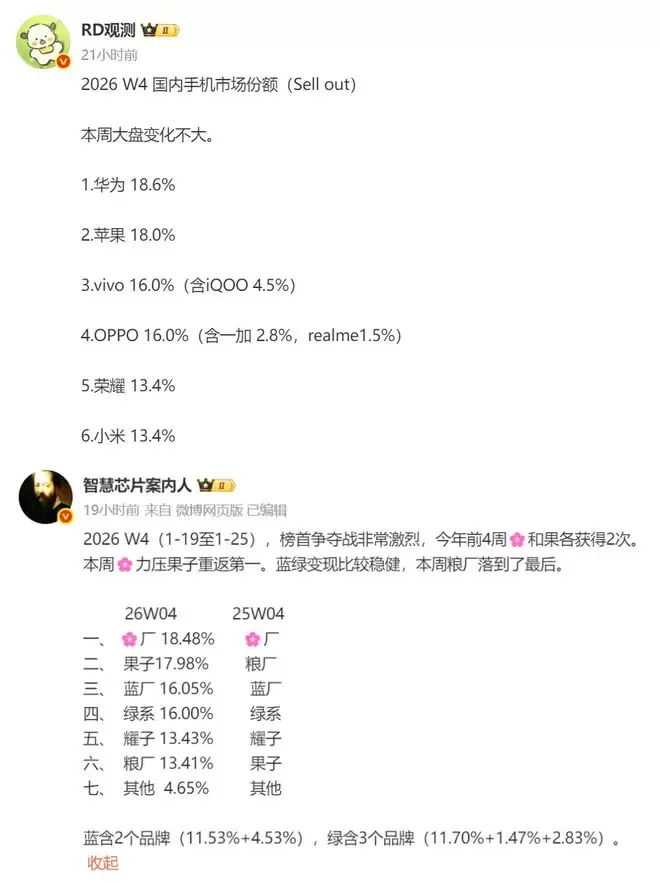 但如果你以为2026年的中国手机市场是华为一骑绝尘,那这份新鲜出炉的周份额数据可能会让你清醒一下。