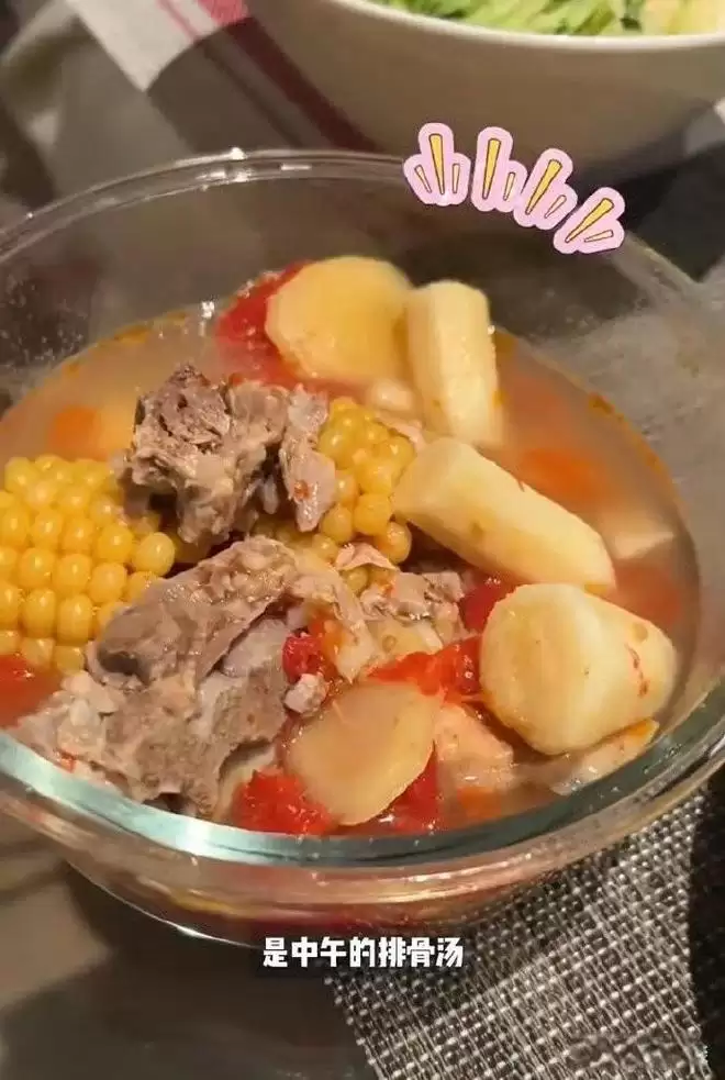 车晓拿着勺子给闺蜜分汤的时候还笑着说,这排骨昨天做太多没吃完,今天热过之后更入味,让大家一颗玉米粒都别浪费。