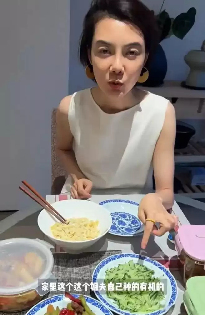她常说自己种的黄瓜、西红柿能直接生吃,不用担心农药残留,冰箱里从来没有外卖,晚饭常是水煮花生、毛豆,白天喝自己配的枸杞黄芪茶,不像其他明星总吃山珍海味。