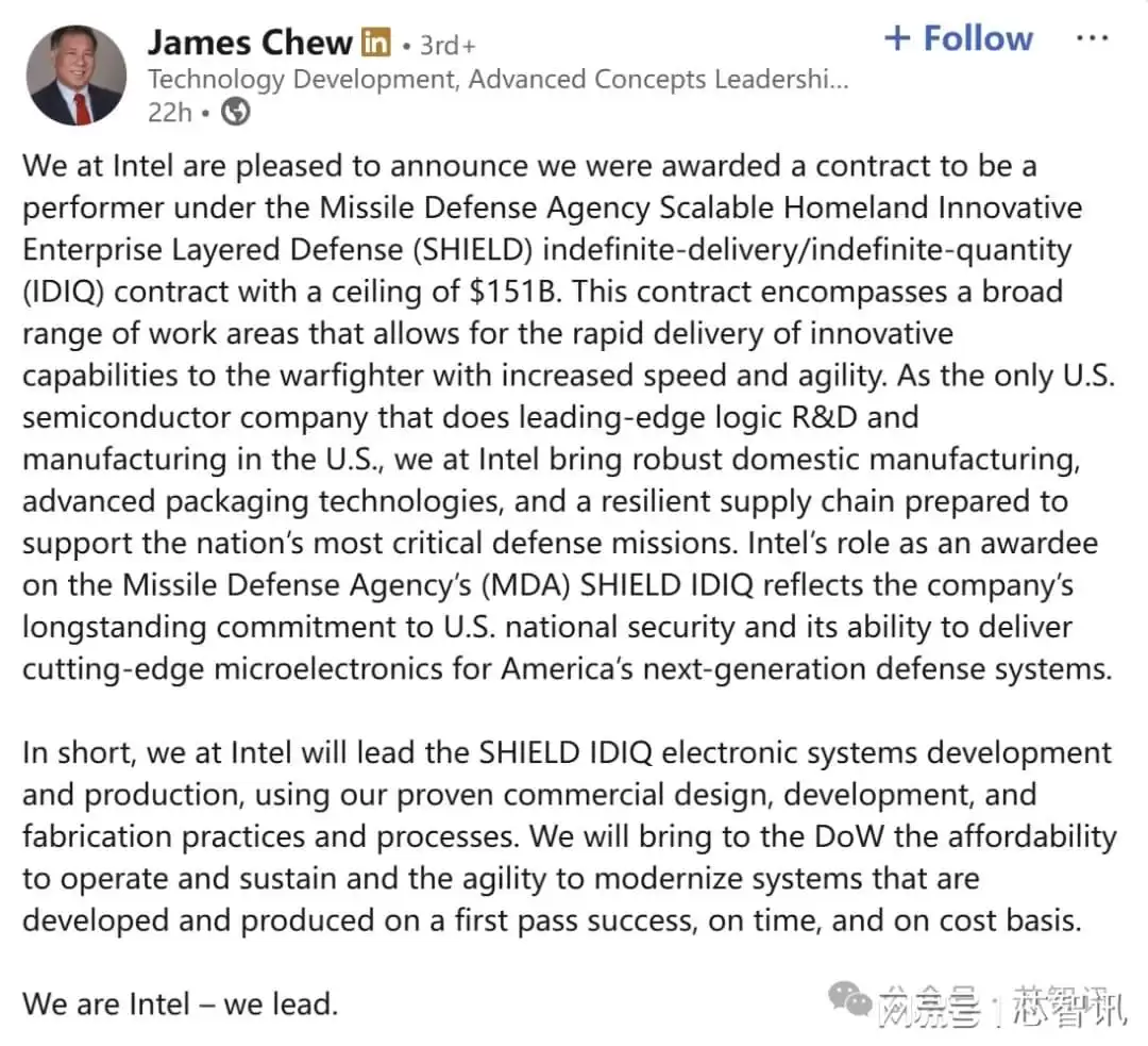 当地时间1月20日,英特尔的新任政府技术副总监James Chew正式宣布,公司成功获得美国战争部(原国防部)一项重要合同,成为其导弹防御局可扩展国土创新企业分层防御项目无限期交付/无限量合同的芯片供应商,合同最高限额为1510亿美元。