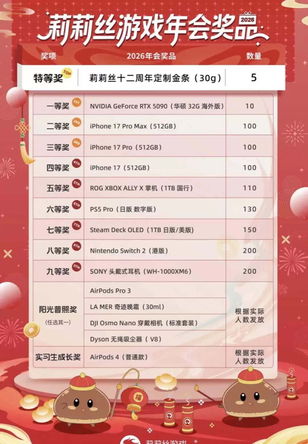 除了车企,科技公司和游戏公司更夸张。莉莉丝游戏2026年年会上,奖品有30克定制金条、XBOX、PS5等。阳光普照奖可以在AirPods Pro 3、戴森吸尘器等奖品任选其一,连实习生都有专属福利。
