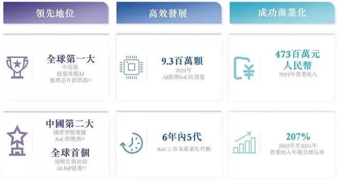 根据灼识咨询的数据,按2024年出货量计,爱芯元智是全球第一大中高端视觉端侧AI推理芯片提供商(市占率为24.1%)、全球第五大视觉端侧AI推理芯片提供商(市占率为6.8%)、中国第二大国产智能驾驶SoC供应商(售出超过51.8万颗智能汽车SoC)、中国第三大边缘AI推理芯片供应商(市占率为12.2%)。