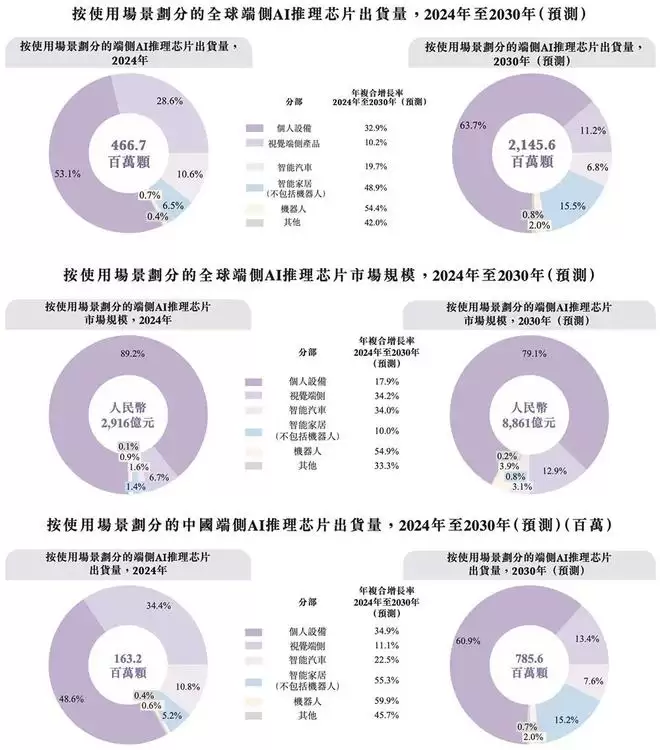 从应用端看,根据招股书,其AI推理芯片的应用场景涵盖个人设备、智能汽车、信息系统等领域,这些细分市场预计到2030年将在全球市场实现54.4%、48.9%及19.7%的出货量年复合增长率,在中国市场有望以更高增速发展,分别达到59.9%、55.3%、22.5%。