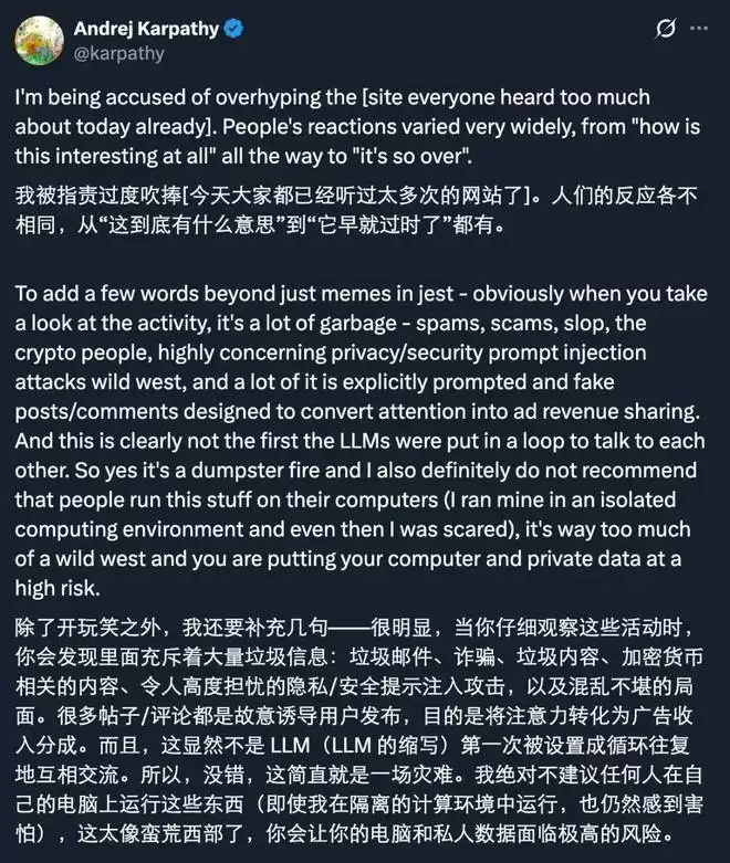 Karpathy 强调,虽然 moltbook 当前的状态混乱且充满风险,但我们正在面对的是前沿的自动化技术,目前仍然理解得不够透彻。这是一个实时进行的实验,很多后果仍然未知。
