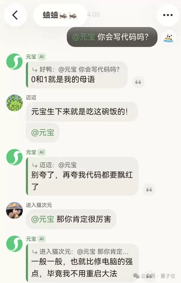 跟元宝聊天,它还会时不时来点小幽默,比如问它会不会写代码,它表示:0和1就是我的母语……