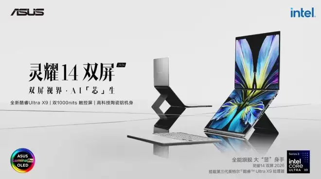 华硕灵耀14双屏2026发布:酷睿Ultra X9加持,重塑移动办公