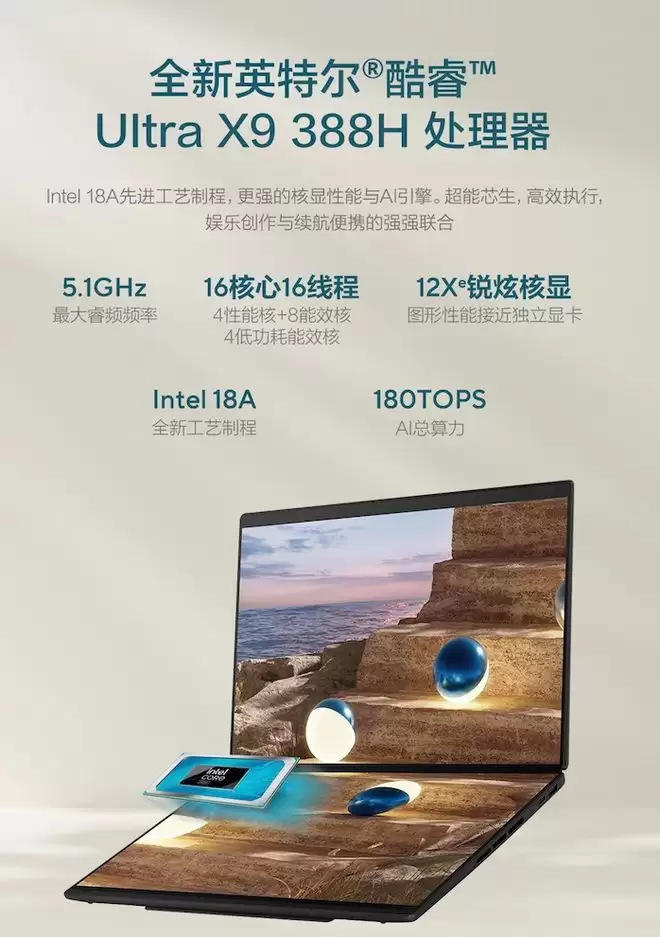 在性能上,华硕灵耀 14 双屏 2026 搭载了英特尔第三代酷睿 Ultra X9(Panther Lake)处理器,最高可选酷睿 Ultra X9 388H 处理器,基于最前沿的 Intel 18A 工艺制程打造,16 核心 16 线程,包括 4 性能核 +8 能效核 +4 低功耗能效核。同时其内建的新一代 NPU 与核显协同工作,使得整机的 AI 总算力高达 180 TOPS,能够从容应对日益复杂的本地 AI 运算需求。