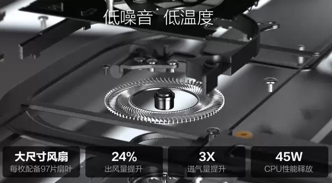 为了提升散热效率,系统内部配备了拥有 97 片大扇叶的风扇,用以强力控温。在结构设计上,进风口面积较上代产品扩增 3 倍,这一改变直接使得出风量提升了 24%。得益于这种高效的散热设计,整机能够实现至高约 45W TDP 的性能释放。这对于一款 14 英寸的轻薄本而言已经是相当可观了,确保了机器即便在面对多任务办公、运行 PS / LR 等轻度创作软件、执行 AI 工具运算,甚至是进行休闲游戏娱乐等高负载场景下,仍能保持稳定运行,真正做到了高效生产力与舒适使用体验的兼得。