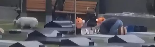 现场的另外一个镜头不难看出,雕像的旁设有一座立方体立碑,上面刻有 “S” 字样。