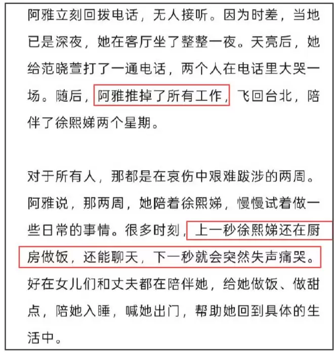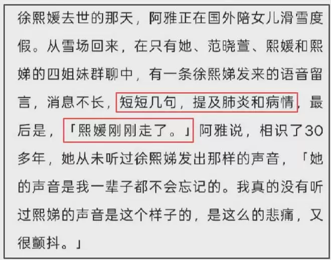 大S去世,最悲痛的人无疑是妹妹小S。阿雅回忆大S去世当天,小S在姐妹群里公布大S死讯,声音是阿雅从没听过的悲痛颤抖。小S在群里发的消息不长,似乎是在和姐妹们实时同步大S的最后时刻,说了肺炎和病情,最后才说了一句“熙媛刚刚走了”。