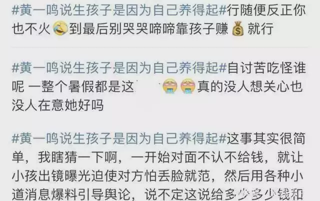现在,黄一鸣总算是心满意足了,于是她开始打造自己是个“独立女性”的形象,说她能生下孩子,是因为她觉得自己养得起。这话一出,网友们立马就不买账了,纷纷吐槽她一边在网上追着要钱,一边还想当女强人,指责她说话做事一会儿一个样。