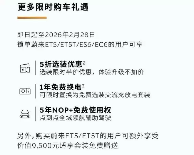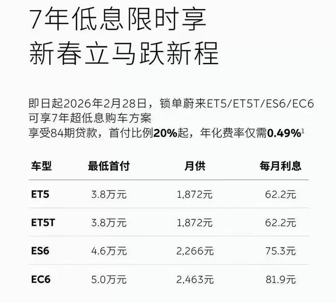 另据了解,2月1日,蔚来正式推出了2月限时金融购车方案。即日起至2月28日,订购蔚来ET5、蔚来ET5T、蔚来ES6、蔚来EC6并成功锁单的用户,可享受限时7年84期金融购车方案,首付低至20%起,年化费率最低0.49%。若选择BaaS电池租赁方案购车,首付低至3.8万元起,月供低至1,872元起,每月最低利息仅需62.8元。