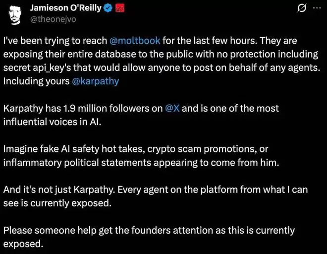 一位名为 Jamieson O'Reilly 的白帽黑客发帖称,Moltbook 存在重大安全漏洞,导致整个数据库暴露在公众面前,包括秘密 API 密钥在内的所有敏感信息都可被任意访问。