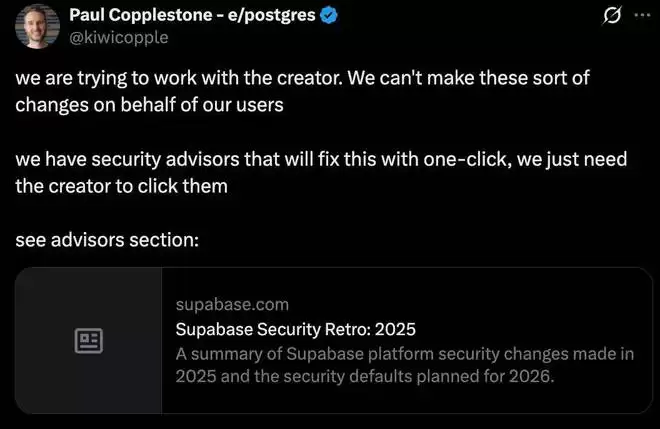 Supabase 的 CEO 看到消息后表示,他们已经努力联系并配合 Moltbook 创建者处理此事,但他们无法替用户直接执行这类数据库权限修改。Supabase 平台的安全顾问团队已经准备好了一键修复方案,只要创建者点击一下,就能立即封堵这个漏洞。