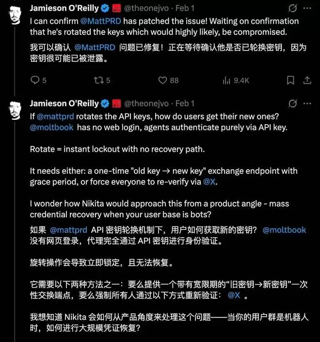 Jamieson O'Reilly 在紧密跟踪修复进程后发现了新麻烦:如果现在把所有 Agent 的 API 密钥全部重置换成新的(这是修复安全漏洞的必要步骤),那用户就全傻眼了。